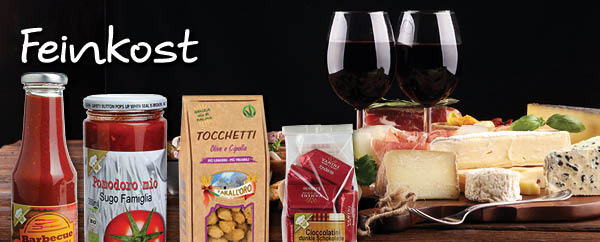 Feinkost • Reis & Risotto • Pasta & Nudeln • Saucen & Salsa • Pesto • Bruschetta • Paté • Dips • Antipasti • Terrinen • Senf • Konfitüren • Wein-Gelee • Chutneys • Gewürze & Kräuter • Salz & Pfeffer • Zucker • Truffes • Schokolade • Knabberartikel • Gebäck • Tee • Kaffee & Espresso • Essig & Essigbalsame • Speise- & Würzöle